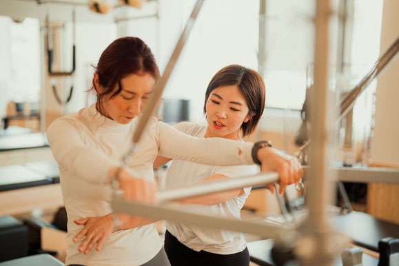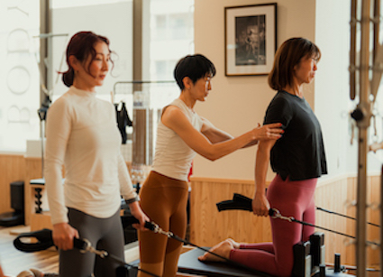 リフォーマーなど、ピラティスの専用器具を使うことで、正しく関節をうごかすことができます。リフォーマー4台、キャデラック1台の少人数制なので、お客さま一人一人、正しく動けるように指導できます。※撮影は大阪堀江店